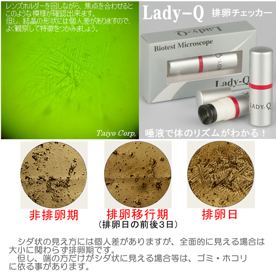 一般的には、排卵日は低温期と高温期の境目(低温期の最後の日)とされています。基礎体温表の説明にもそう書かれていると思います。 しかし、排卵の起こる日は、人により幅があり必ずしも低温期の最後の日が排卵日とは言えません。 一体、排卵が起こったことを本人が知るのはいつなのでしょう? 低温期から高温期へ移行するのには、2~3日かかるのが多いようです。完全に高温期になった時に本人は「ああ、今高温期なんだ。」と思うわけです。しかし、この時すでに排卵から2~3日が経過してしまっていることになります。 通常、卵子の寿命は24時間くらいと言われているので、本人が排卵があったことを知った時には、卵子の寿命が終わってしまっている可能性が高いことになります。 これでは、なかなか受精のタイミングをつかむことはできません。 では、どうやって排卵の時期を確認すればいいのでしょう? 妊娠の確率を上げるために一番いいのは、排卵があったときに受精の為の準備が整った精子が待機しているという状態を作ることです。ということは、排卵が近いことをあらかじめ察知しておくことが望ましいのです。 体温が上がる前に、排卵が近いことを知る方法はないでしょうか? 排卵が近くなると、FSH(卵胞刺激ホルモン)が卵巣へ分泌され卵巣の中の卵胞(卵子の元)を刺激します。刺激されたいくつかの卵胞が大きくなり、その時、卵胞ホルモン(エストロゲン)が分泌されます。この卵胞ホルモン(エストロゲン)が血液の中を通って子宮に到達し、子宮内膜を成長させ妊娠のための準備をします。卵胞ホルモン(エストロゲン)の量が多くなると、シダ状の模様がはっきり現れてきます。 血液中の卵胞ホルモン(エストロゲン)の量が多くなると、脳が「妊娠の準備が進んでいる。」と判断し、FSH(卵胞刺激ホルモン)の分泌をやめるよう指令を送ります。変わりに、LH(黄体化ホルモン)が分泌され体温が上がります。 つまり、卵胞ホルモン(エストロゲン)の量が多くなってシダ状の模様がはっきり見えてきた時は、「子宮での妊娠の準備が進み、排卵が近い。」と言えます。 LH(黄体化ホルモン)は、卵巣へ分泌され、十分に成長した卵胞をポンと破裂させます。これが排卵です。排卵後の卵巣では、LH(黄体化ホルモン)が新しい細胞(黄体)を作り、この黄体から黄体ホルモン(プロゲステロン)が分泌されます。黄体ホルモン(プロゲステロン)が分泌されると、シダ状の模様 はなくなります。 シダ状の模様を確認することで、ホルモンの分泌状況を目で見ることができ、「排卵が近い」ことを知ることができます。